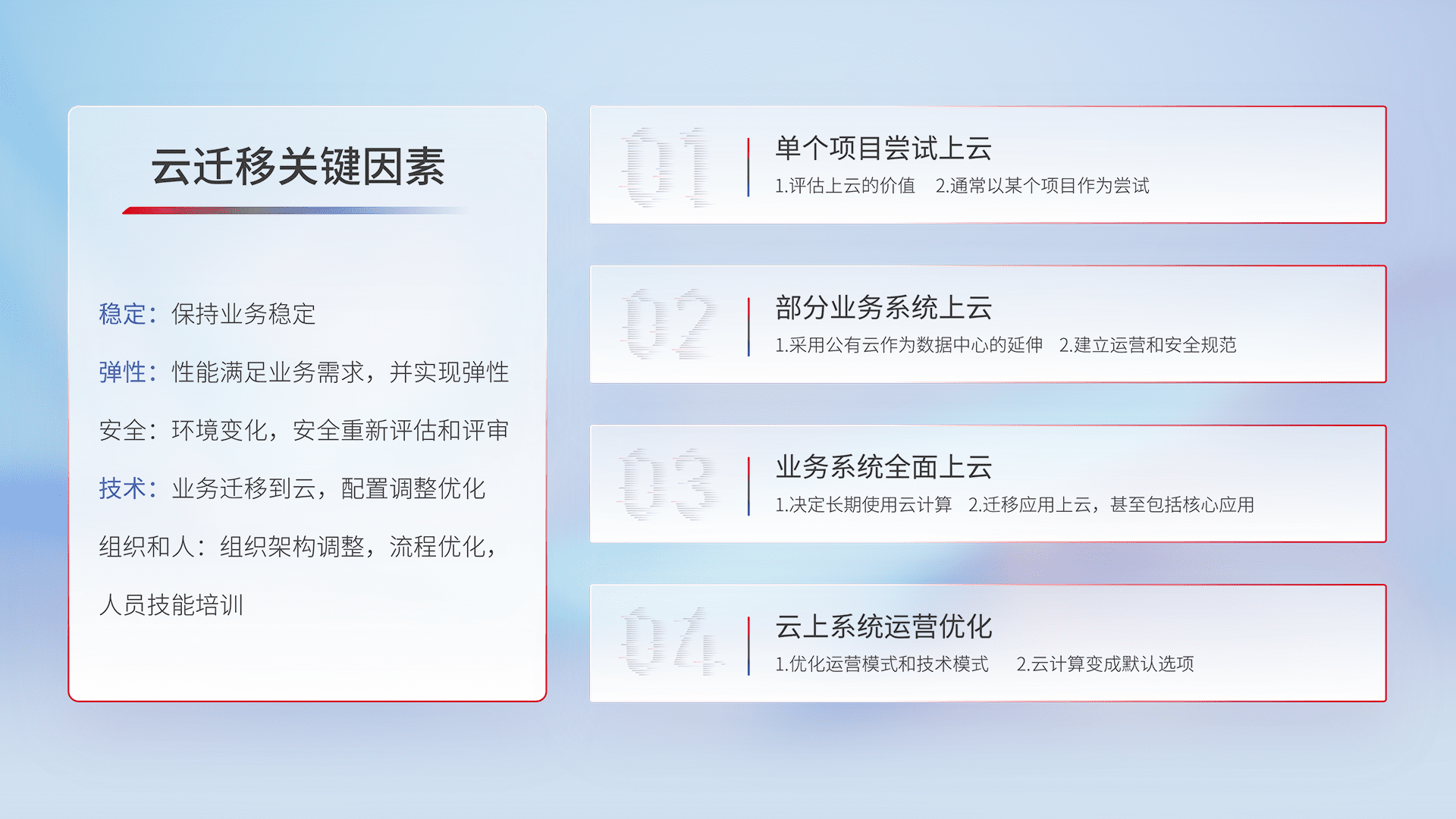 结合实际业务,,,,从规划设计、、、云平台选型、、、云原生改造、、数据迁移、、集成交付,,,迁移全过程为客户识别最佳上云路径,,,做好风险识别管理,,,设计网络架构、、、身份权限、、安全审计合规、、操作审计、、、日志审计、、监控告警策略、、、、多站点容灾设计等,,,,对云上基础设施进行整体规划,,提升IT治理水平,,以满足弹性、、、高可用、、高性能的需求。。。。