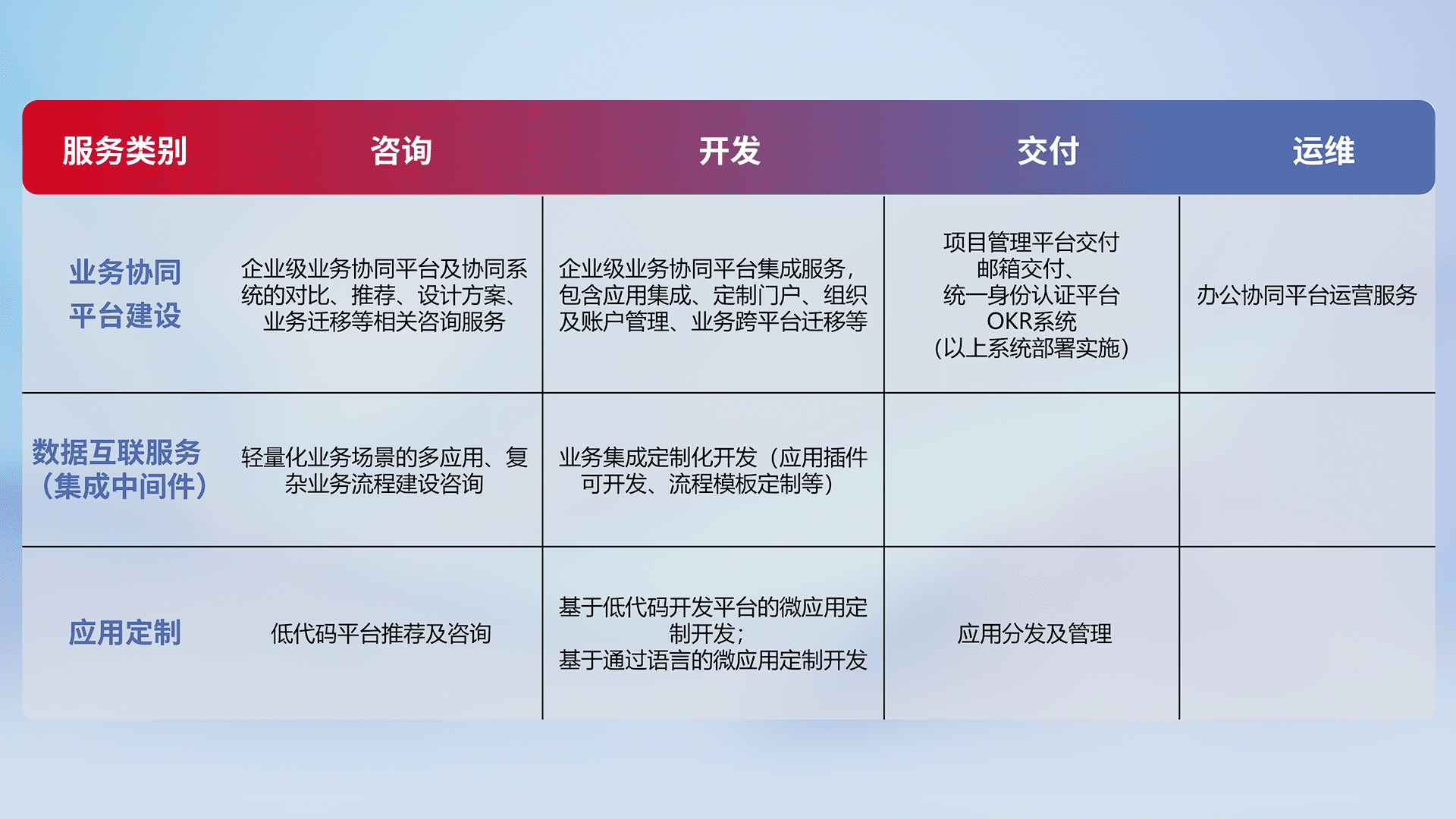 针对钉钉、、企微、、、IDaas等平台级产品提供产品的规划、、、、方案、、、交付、、定制化开发等服务,,,,实现如统一协同办公、、、、智能客户服务、、、混合会议管理、、、智能数据查询、、、等业务场景,,,实现数字化转型。。。